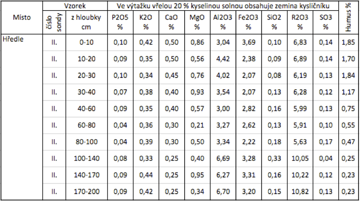 Chemický rozbor byl proveden po extrakci zeminy 20% vřelou kyselinou solnou; tento rozbor umožňuje dobré posouzení procesu zvětrávacího. Humus byl stanoven podle Rollova titračně.