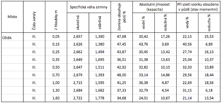 Z hlavních vlastností stanoven celkový objem pórů v (rostlé) zemině, maximální kapilární vodní kapacita a minimální vzdušná kapacita, jakož i stav momentního provlhčení a provzdušení vzorku odebrané zeminy.