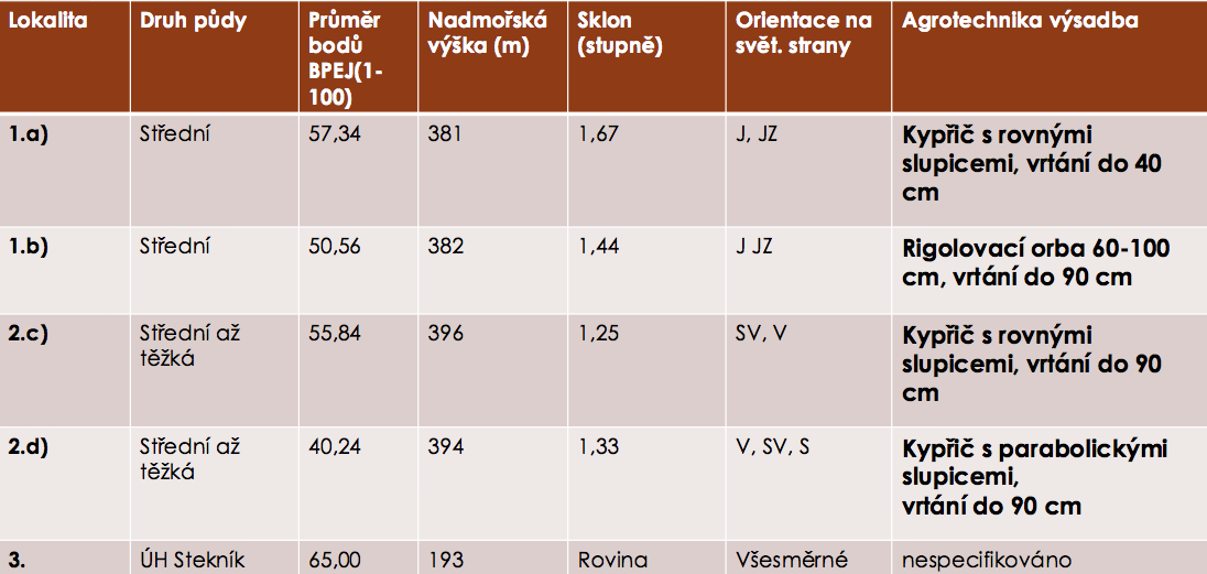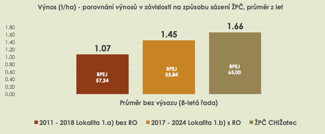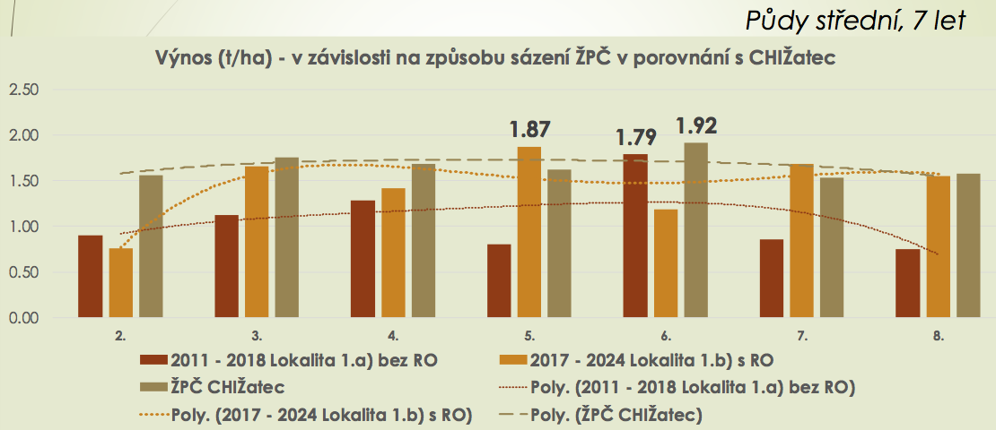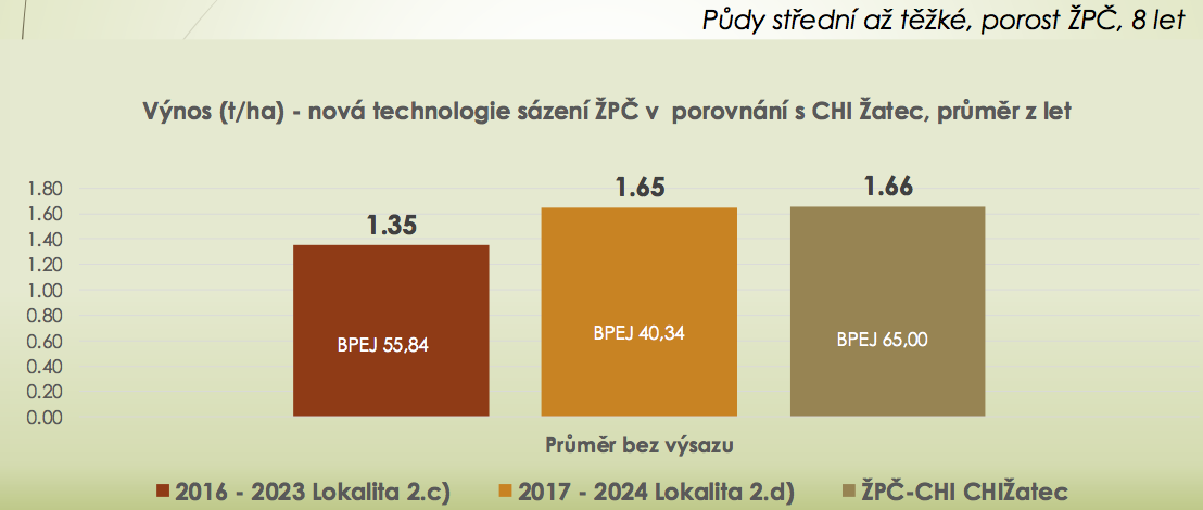 4. Použití technologie hlubokého jamkování (90cm) s nevhodným kypřiči nebo bez rigolovací orby nemá dostatečný, jen omezený výnosový efekt. Na středních až těžších půdách (lokalita 2) dochází ke snížení výnosu na 1,35 t/ha ŽPČ oproti dosažitelnému výnosu (lokalita 2) 1,65 t/ha. Výnosový potenciál daného stanoviště není využit.