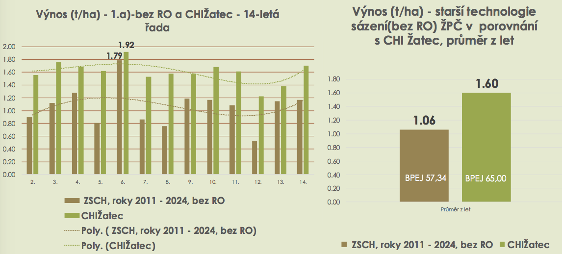 1. Technologie hlubokého jamkování (90cm) v kombinaci s rigolovací orbou na střední půdě bez závlahy (lokalita 1) zvyšuje výnos chmele ŽPČ z výnosové hladiny 1,07 t/ha na 1,45 t/ha v šetřeném období věku chmelnice