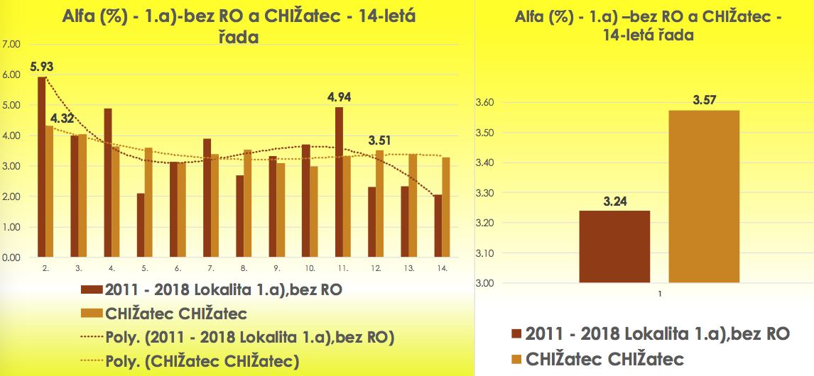 a) Metoda - Šetření byla prováděna analýzou a komparací-porovnáním časových řad výnosů chmele (t/ha) a obsahů alfa hořkých látek (%) v obdobích 1-22 let věku chmelnice (přesněji chmelového porostu-dále jen chmelnice), přičemž jako rok 1 je první sklizňový rok (první sklizeň v roce následujícím po vysázení chmelové sadby na zkoumaném stanovišti). Rok 0 je tedy rok, v kterém byl chmel vysázen a nebyla dosažena sklizeň, v těchto výpočtech nebylo s rokem 0 kalkulováno.